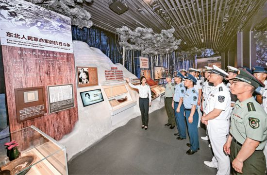 2025年7月7日,纪念全民族抗战爆发88周年仪式暨《为了民族解放与世界和平》主题展览开幕式在中国人民抗日战争纪念馆举行。图为当日解放军官兵参观主题展览。 新华社记者 陈晔华/摄