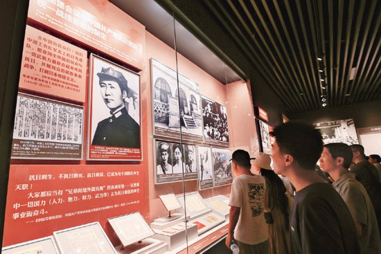 2025年7月8日,在中国人民抗日战争纪念馆举办的《为了民族解放与世界和平》主题展览面向社会公众开放。展览分为八个部分,展出1525张照片、3237件文物,全面回顾抗战烽火、峥嵘岁月。图为7月13日,参观者在参观主题展览。 中新社发 陈晓根/摄